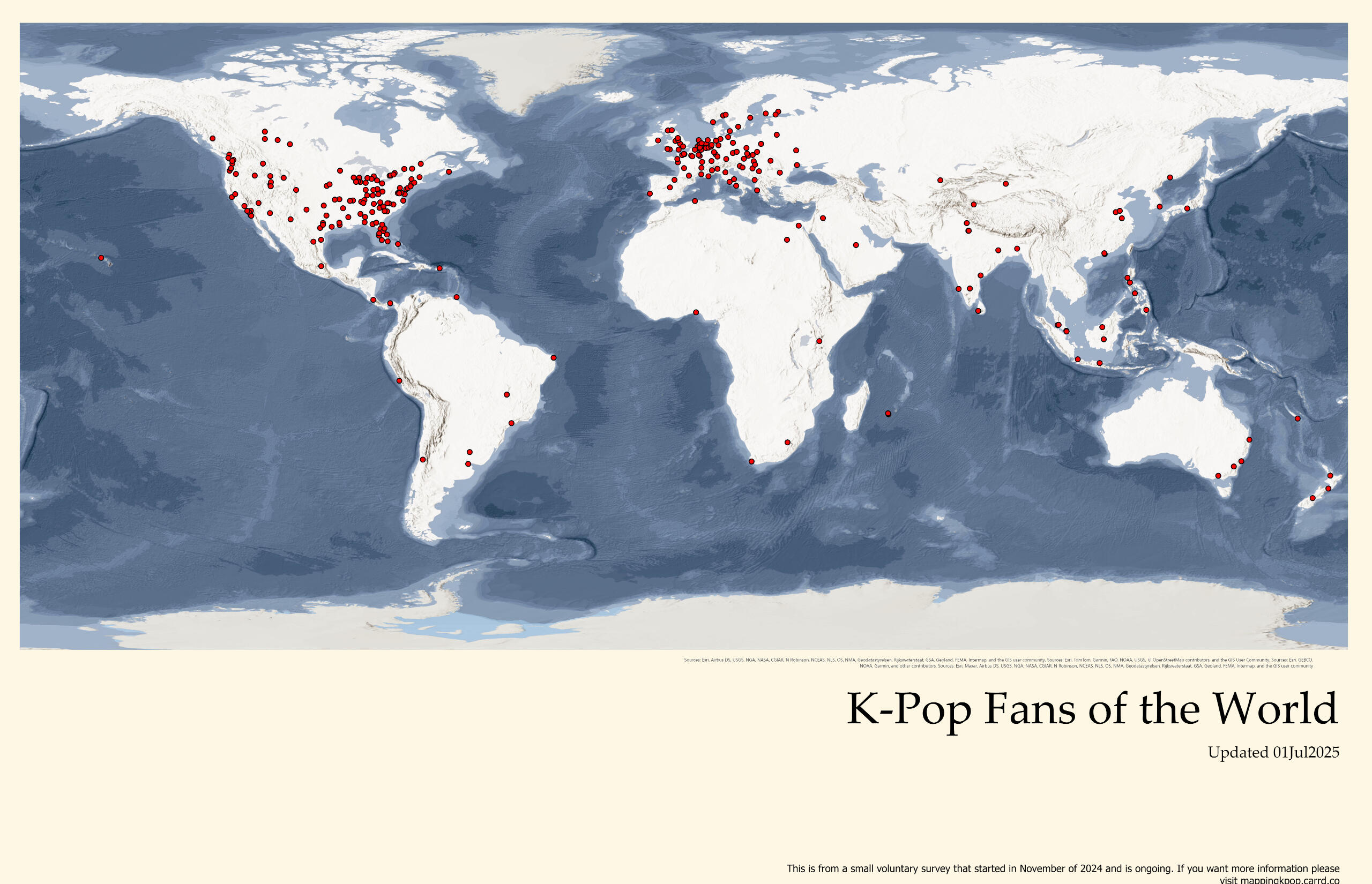 As someone who shares a love for community, K-Pop, and map-making, I feel as though that this project was the best way for me to combine those loves that I have together.I love compiling data and looking at trends as well as comparing said trends, and I think this would be a fun way for people to get an idea of who may be around them and see that K-Pop is both so diverse as well as such a small world.If you have any questions or concerns, please fill out the form below!Thank you to any and everybody who wants to join in this project, I promise I will do my best to keep you all updated and to hopefully implement an interactive map before long.Cheers!